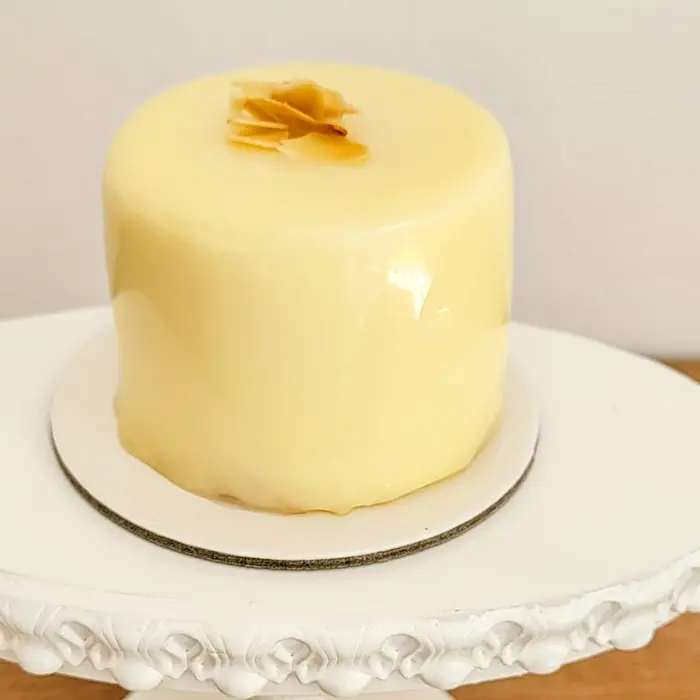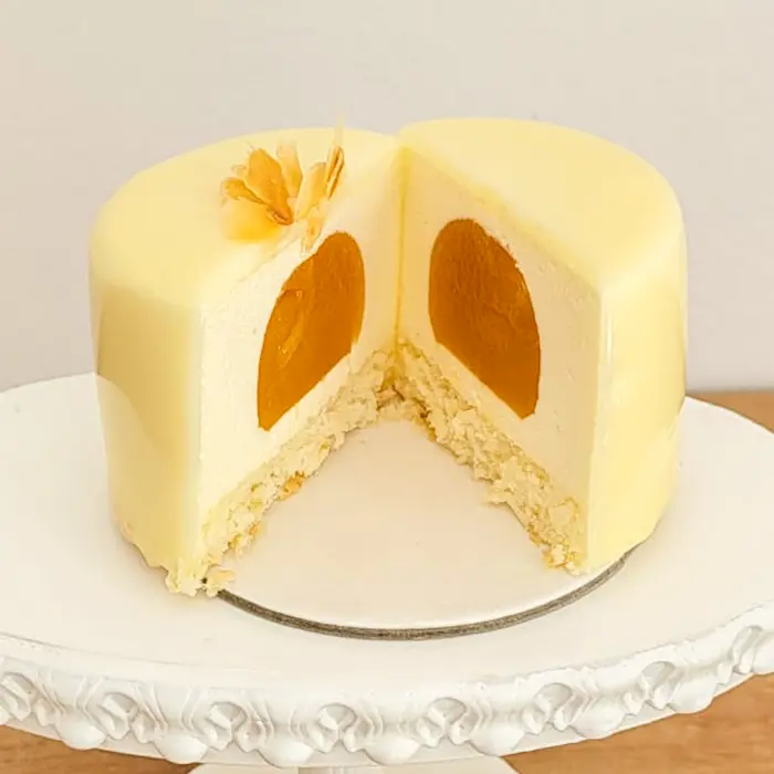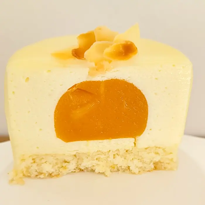 Glazura lucioasă de ciocolată albă adaugă un strop de rafinament, completând armonios gustul catifelat și echilibrat. Este desertul ideal pentru cei care iubesc aromele tropicale reinterpretate într-o formă fină și modernă — o experiență care te poartă cu gândul la o zi senină, plină de lumină și bucurie.